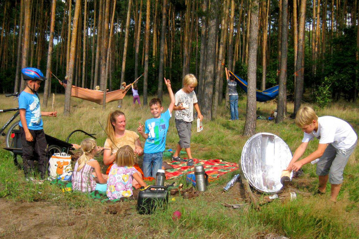 mit dem Schuleintritt kommen ganz neue Anforderungen auf ihr Kind zu. Daher ist es uns wichtig, ihrem Kind einen Ausgleich durch Bewegung und Entspannung zu schaffen. Nirgendwo ist dies so gut möglich wie draußen im Grünen. Deshalb bieten wir tägliche Ausflüge mit dem Fahrrad in die umliegende Natur an. Vertraute Plätze in der Parforceheide, auf den Nuthe-Wiesen und im Wald laden die Kinder zum Forschen, Entdecken, Bauen, Toben, Klettern oder Träumen in der Hängematte ein. Gerade Schulkinder brauchen und genießen solche Freiräume am Nachmittag sehr. Unsere erfahrenen Pädagog*innen teilen dabei ihr Wildniswissen und vor allem ihre Begeisterung mit den Kindern.
